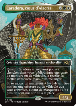 Quand Caradora arrive, vous pouvez chercher dans votre bibliothèque une carte de monture ou de véhicule, la révéler, la mettre dans votre main, puis mélanger. Si au moins un marqueur +1/+1 devait être mis sur une créature ou un véhicule que vous contrôlez, autant de marqueurs +1/+1 plus un sont mis sur lui à la place.