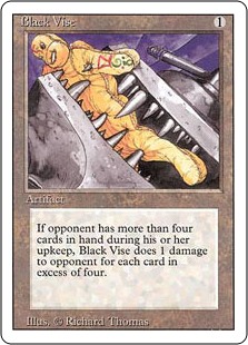 As Black Vise enters the battlefield, choose an opponent. At the beginning of the chosen player's upkeep, Black Vise deals X damage to that player, where X is the number of cards in his or her hand minus 4.