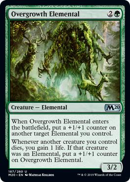 When Overgrowth Elemental enters the battlefield, put a +1/+1 counter on another target Elemental you control. Whenever another creature you control dies, you gain 1 life. If that creature was an Elemental, put a +1/+1 counter on Overgrowth Elemental.