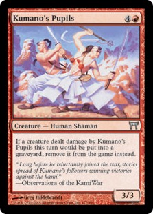 Kumano's Pupils must be on the battlefield when the creature would be put into a graveyard in order to exile it. [2004-12-01]