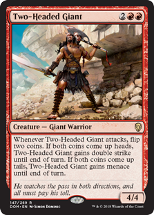 • Whenever Two-Headed Giant attacks, flip two coins. If both coins come up heads, Two-Headed Giant gains double strike until end of turn. If both coins come up tails, Two-Headed Giant gains menace until end of turn.