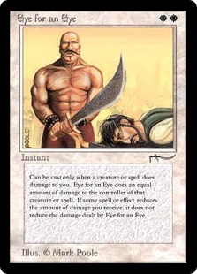 Can be cast only when a creature or spell does damage to you. Eye for an Eye does an equal amount of damage to the controller of that creature or spell. If some spell or effect reduces the amount of damage you receive, it does not reduce the damage dealt by Eye for an Eye.