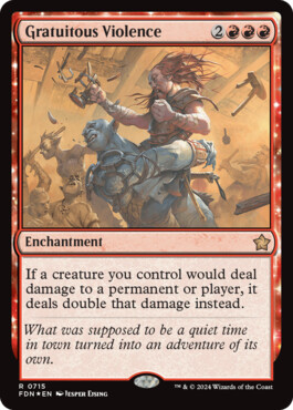 • Gratuitous Violence - Magic: The Gathering Foundations (Rare) Gratuitous Violence - Bloomburrow Commander (Rare) Gratuitous Violence - Adventures in the Forgotten Realms Commander (Rare) Gratuitous Violence - Conspiracy: Take the Crown (Rare) Gratuitous Violence - Onslaught (Rare)