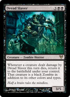 Whenever a creature dealt damage by Dread Slaver this turn dies, return it to the battlefield under your control. That creature is a black Zombie in addition to its other colors and types.