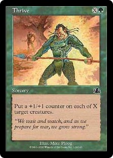 It means X different creatures. You can't give more than one +1/+1 counter to a creature with this spell. [2004-10-04]