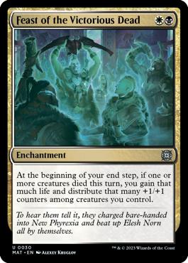 If no creatures have died by the time your end step begins, the ability of Feast of the Victorious Dead won’t trigger at all. Provided the ability does trigger, it will count the number of creatures that have died as the ability resolves. In other words, creatures that die in response to the ability will count as long as at least one died previously to have the ability trigger in the first place. [0000-00-00]