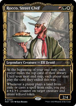 Au début de votre étape de fin, chaque joueur exile la carte du dessus de sa bibliothèque. Jusqu'à votre prochaine étape de fin, chaque joueur peut jouer la carte qu'il a exilée de cette manière. À chaque fois qu'un joueur joue un terrain depuis l'exil ou lance un sort depuis l'exil, vous mettez un marqueur +1/+1 sur une créature ciblée et vous créez un jeton Nourriture.