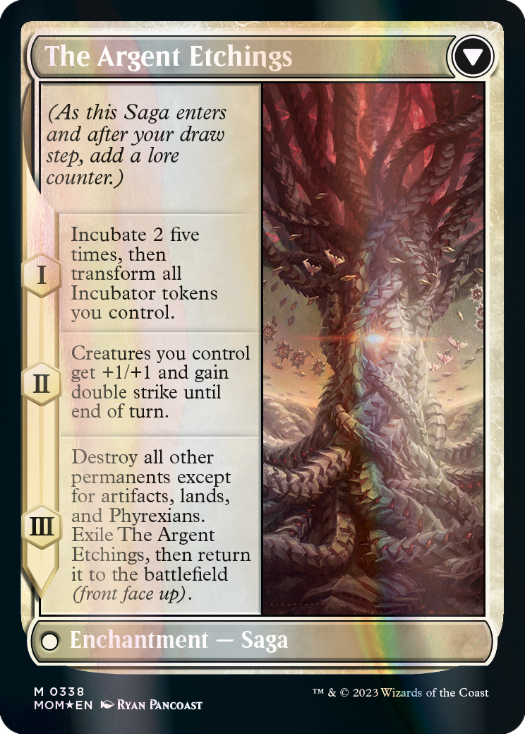 III — Destroy all other permanents except for artifacts, lands, and Phyrexians. Exile The Argent Etchings, then return it to the battlefield (front face up).