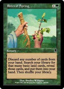 Défaussez-vous de n'importe quel nombre de cartes de votre main. Cherchez dans votre bibliothèque ce même nombre de cartes de terrain de base, révélez ces cartes et mettez-les dans votre main. Mélangez ensuite votre bibliothèque.