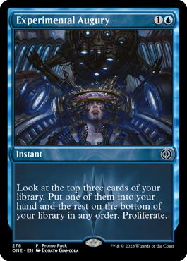Look at the top three cards of your library. Put one of them into your hand and the rest on the bottom of your library in any order. Proliferate.