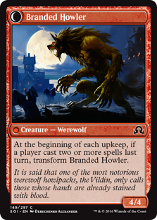 At the beginning of each upkeep, if a player cast two or more spells last turn, transform Branded Howler.