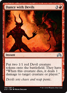 • Put two 1/1 red Devil creature tokens onto the battlefield. They have "When this creature dies, it deals 1 damage to target creature or player."