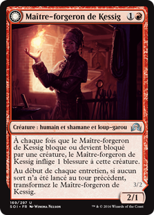 À chaque fois que le Maître-forgeron de Kessig bloque ou devient bloqué par une créature, le Maître-forgeron de Kessig inflige 1 blessure à cette créature. Au début de chaque entretien, si aucun sort n'a été lancé au tour précédent, transformez le Maître-forgeron de Kessig.