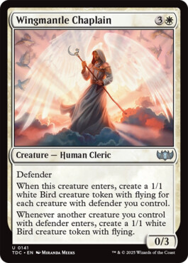 When Wingmantle Chaplain enters the battlefield, create a 1/1 white Bird creature token with flying for each creature with defender you control.