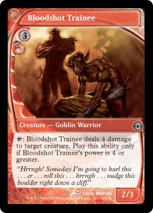 : Bloodshot Trainee deals 4 damage to target creature. Play this ability only if Bloodshot Trainee's power is 4 or greater.