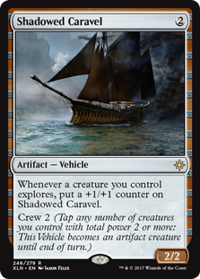 Whenever a creature you control explores, put a +1/+1 counter on Shadowed Caravel. Crew 2 (Tap any number of creatures you control with total power 2 or more: This Vehicle becomes an artifact creature until end of turn.)