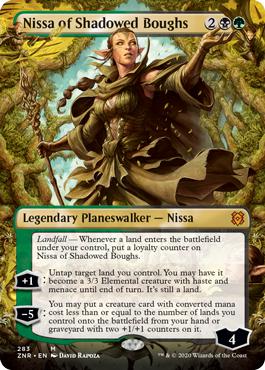 — Whenever a land enters the battlefield under your control, put a loyalty counter on Nissa of Shadowed Boughs. +1: Untap target land you control. You may have it become a 3/3 Elemental creature with haste and menace until end of turn. It's still a land. ?5: You may put a creature card with converted mana cost less than or equal to the number of lands you control onto the battlefield from your hand or graveyard with two +1/+1 counters on it.