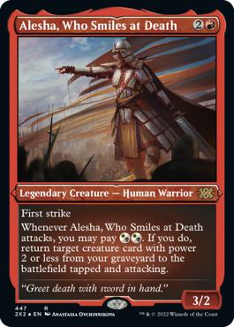• Alesha, Who Smiles at Death - Dominaria United Commander (Rare) Alesha, Who Smiles at Death - Double Masters 2022 (Rare) Alesha, Who Smiles at Death - Double Masters 2022 (Rare) Alesha, Who Smiles at Death - Time Spiral Remastered (Spécial) Alesha, Who Smiles at Death - Commander 2020 (Ikoria) (Rare) Alesha, Who Smiles at Death - Commander 2016 (Rare) Alesha, Who Smiles at Death - Fate Reforged (Rare)