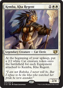 At the beginning of your upkeep, put a 2/2 white Cat creature token onto the battlefield for each Equipment attached to Kemba, Kha Regent.