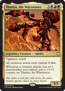 Vigilance, portée Toutes les créatures attaquent à chaque combat si possible. À chaque fois qu'une créature vous attaque ou attaque un planeswalker que vous contrôlez, mettez un marqueur +1/+1 sur Thantis, la tisseuse de guerre.