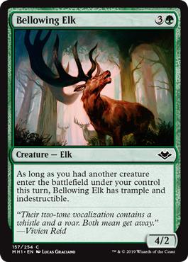 Tant que vous avez fait arriver une autre créature sur le champ de bataille sous votre contrôle ce tour-ci, l'Élan beuglard a le piétinement et l'indestructible.