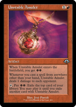 , payez {e}{e} : Exilez la carte du dessus de votre bibliothèque. Vous pouvez la jouer jusqu'à ce que vous exiliez une autre carte avec l'Amulette instable.Cet espace est réservé aux membres enregistrés sur MTG Addict.