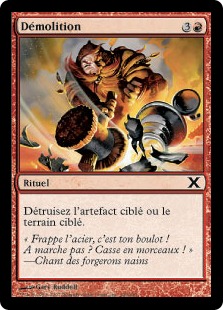 • Démolition - Ravnica Remastered (Commune) Démolition - La Guerre des Planeswalkers (Commune) Démolition - Ixalan (Commune) Démolition - Kaladesh (Commune) Démolition - Magic Origines (Commune) Démolition - Theros (Commune) Démolition - Magic 2014 (Commune) Démolition - Avacyn ressuscitée (Commune) Démolition - Magic 2011 (Commune) Démolition - Zendikar (Commune) Démolition - 10ième Edition (Commune) Démolition - 9ième Edition (Peu commune) Démolition - 8ième Edition (Peu commune) Démolition - Odyssée (Peu commune)