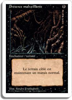 The enchanted land loses its existing land types and any abilities printed on it. It now has the land type Swamp and has the ability to tap to add {B} to its controller's mana pool. Evil Presence doesn't change the enchanted land's name or whether it's legendary, basic, or snow. [2009-10-01]