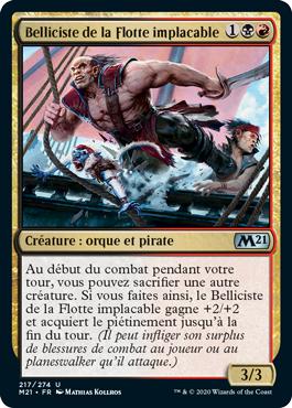Au début du combat pendant votre tour, vous pouvez sacrifier une autre créature. Si vous faites ainsi, le Belliciste de la Flotte implacable gagne +2/+2 et acquiert le piétinement jusqu'à la fin du tour. (Il peut infliger son surplus de blessures de combat au joueur ou au planeswalker qu'il attaque.)