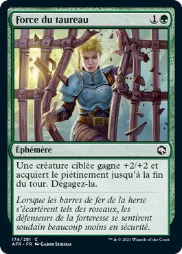 • Une créature ciblée gagne +2/+2 et acquiert le piétinement jusqu'à la fin du tour. Dégagez-la.