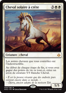 Les autres chevaux que vous contrôlez ont l'indestructible. Au début de chaque étape de fin, si vous avez gagné des points de vie ce tour-ci, créez un jeton de créature 5/5 blanche Cheval.