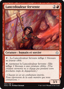 , surmenez la Lancedouleur fervente : Elle inflige 1 blessure à une créature ciblée. (Une créature surmenée ne se dégage pas pendant votre prochaine étape de dégagement.)