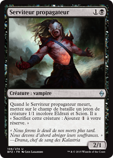 • Quand le Serviteur propagateur meurt, mettez sur le champ de bataille un jeton de créature 1/1 incolore Eldrazi et Scion. Il a « Sacrifiez cette créature : Ajoutez 1 à votre réserve. »