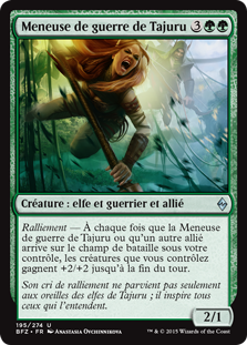 Ralliement — À chaque fois que la Meneuse de guerre de Tajuru ou qu'un autre allié arrive sur le champ de bataille sous votre contrôle, les créatures que vous contrôlez gagnent +2/+2 jusqu'à la fin du tour.