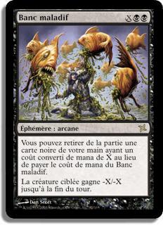 • Vous pouvez retirer de la partie une carte noire de votre main ayant un coût converti de mana de X au lieu de payer le coût de mana du Banc maladif.