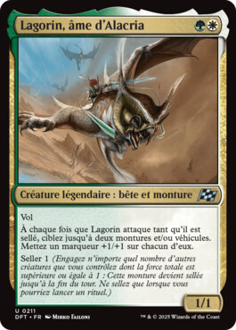 Vol À chaque fois que Lagorin attaque tant qu'il est sellé, ciblez jusqu'à deux montures et/ou véhicules. Mettez un marqueur +1/+1 sur chacun d'eux. Seller 1 (Engagez n'importe quel nombre d'autres créatures que vous contrôlez dont la force totale est supérieure ou égale à 1 : Cette monture devient sellée jusqu'à la fin du tour. Ne sellez que lorsque vous pourriez lancer un rituel.)