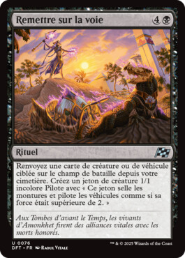 • Renvoyez une carte de créature ou de véhicule ciblée sur le champ de bataille depuis votre cimetière. Créez un jeton de créature 1/1 incolore Pilote avec « Ce jeton selle les montures et pilote les véhicules comme si sa force était supérieure de 2. »