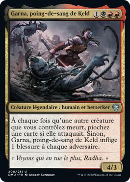 • À chaque fois qu'une autre créature que vous contrôlez meurt, piochez une carte si elle attaquait. Sinon, Garna, poing-de-sang de Keld inflige 1 blessure à chaque adversaire.