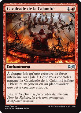 À chaque fois qu'une créature de force inférieure ou égale à 1 que vous contrôlez attaque, la Cavalcade de la Calamité inflige 1 blessure au joueur ou au planeswalker que cette créature attaque.