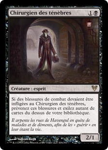 Si des blessures de combat devaient être infligées au Chirurgien des ténèbres, prévenez ces blessures et exilez autant de cartes du dessus de votre bibliothèque.