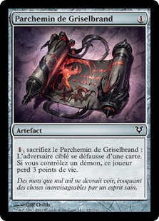 , sacrifiez le Parchemin de Griselbrand : L'adversaire ciblé se défausse d'une carte. Si vous contrôlez un démon, ce joueur perd 3 points de vie.