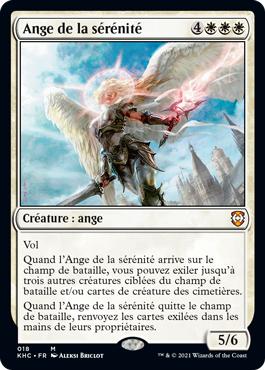 Vol Quand l'Ange de la sérénité arrive sur le champ de bataille, vous pouvez exiler jusqu'à trois autres créatures ciblées du champ de bataille et/ou cartes de créature des cimetières. Quand l'Ange de la sérénité quitte le champ de bataille, renvoyez les cartes exilées dans les mains de leurs propriétaires.