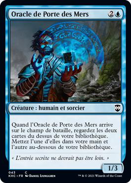 Quand l'Oracle de Porte des Mers arrive sur le champ de bataille, regardez les deux cartes du dessus de votre bibliothèque. Mettez l'une d'elles dans votre main et l'autre au-dessous de votre bibliothèque.