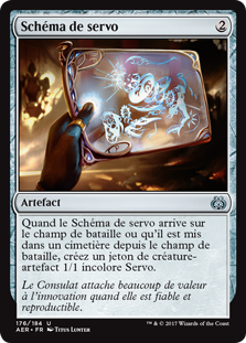 Quand le Schéma de servo arrive sur le champ de bataille ou qu'il est mis dans un cimetière depuis le champ de bataille, créez un jeton de créature-artefact 1/1 incolore Servo.