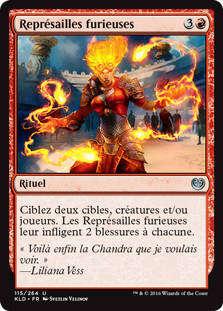 • Ciblez deux cibles, créatures et/ou joueurs. Les Représailles furieuses leur infligent 2 blessures à chacune.