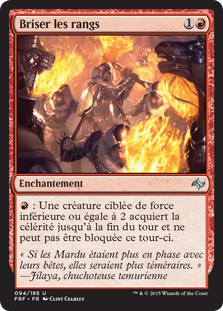 : Une créature ciblée de force inférieure ou égale à 2 acquiert la célérité jusqu'à la fin du tour et ne peut pas être bloquée ce tour-ci.