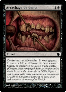 Confrontez un adversaire. Si vous gagnez, le joueur ciblé se défausse de deux cartes. Sinon, ce joueur se défausse d'une carte. (Chaque joueur impliqué dans la confrontation révèle la carte du dessus de sa bibliothèque et met ensuite cette carte au-dessus ou au-dessous de celle-ci. Un joueur gagne si sa carte a un coût converti de mana plus élevé.)