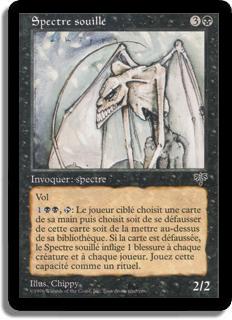 : Target player chooses a card from his or her hand and then chooses either to discard that card or put it on top of his or her library. If the card is discarded, Tainted Specter deals 1 damage to each creature and player. Play this ability as a sorcery.