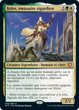 • À chaque fois qu'un autre humain arrive sur le champ de bataille sous votre contrôle, mettez un marqueur +1/+1 sur Kyler, émissaire sigardien.