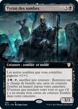 , sacrifiez une créature : Renvoyez sur le champ de bataille une carte de créature Zombie au hasard depuis votre cimetière. N'activez que pendant votre tour et que s'il y a au moins trois cartes de créature Zombie dans votre cimetière.